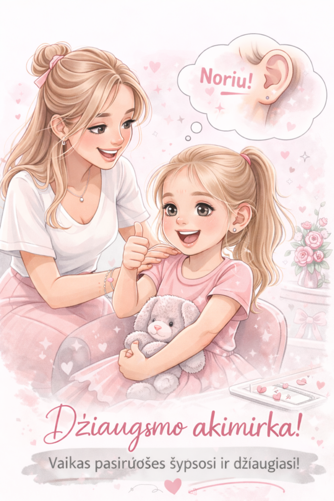auskarų turi norėti ne tik mama, bet ir pats vaikas. Jei vaikas bijo, jaučiasi nesaugiai ar aiškiai sako „nenoriu“, vertėtų šią procedūrą atidėti. Skubėti tikrai nereikia.